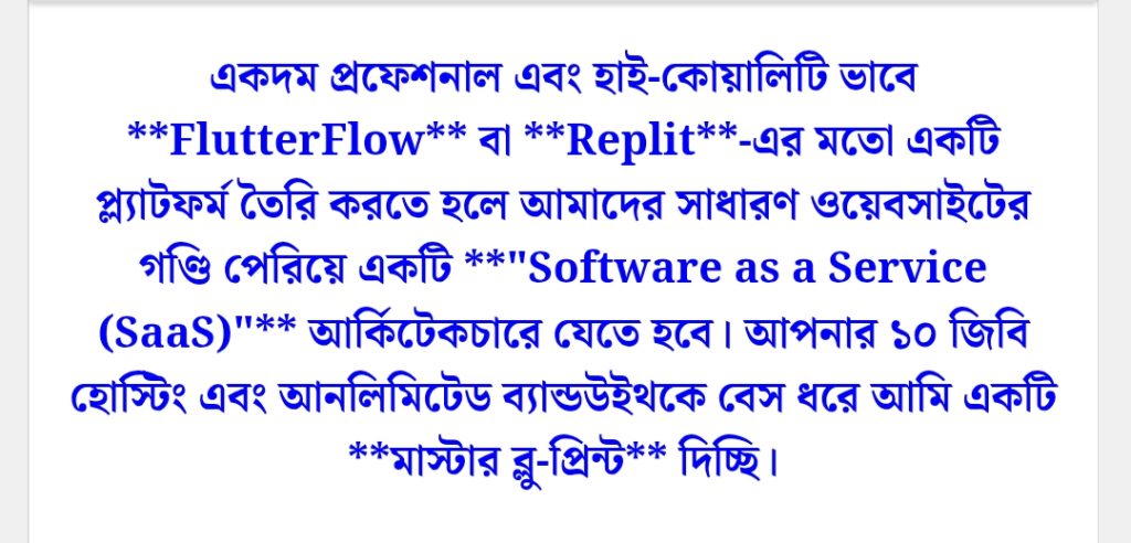 Web Development একদম প্রফেশনাল এবং হাই-কোয়ালিটি ভাবে FlutterFlow বা Replit এর মতো একটি... একদম প্রফেশনাল এবং হাই-কোয়ালিটি ভাবে **FlutterFlow** বা **Replit**-এর মতো একটি প্ল্যাটফর্ম তৈরি করতে হলে আমাদের সাধারণ...